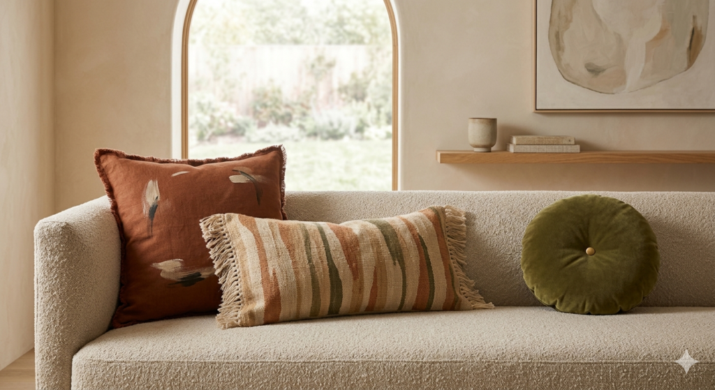- Embrace Color Mixing: Don’t be afraid to pull multiple contrasting colors into your scheme. Choose an anchor color (like the blue from the round pillow) and then layer in complementary, unexpected hues.